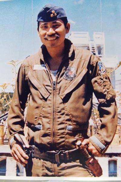 Mặc đồ Biệt Kích , đồ Beo ! Súng Colt 9 ly đeo xệ xệ, chẳng có lon lá ǵ cả. Nếu trong tay không cầm nón bay th́ chẳng ai biết đây là những Sĩ Quan Không Quân hào hoa phong nhă.