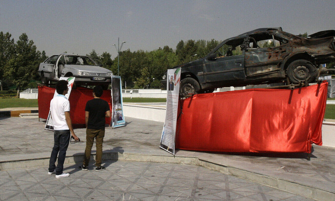 Ô tô của các nhà khoa học hạt nhân bị ám sát được Iran trưng bày năm 2012. Ảnh: AP.