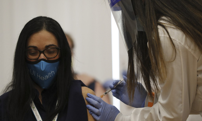 Một bác sĩ tại thành phố Chicago, bang Illinois, được tiêm vaccine Covid-19 hôm 15/12, sau khi Mỹ phê duyệt vaccine của Pfizer. Ảnh: AFP.