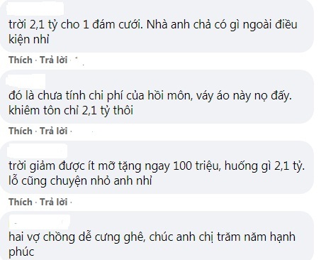 - “Nhà chả có gì ngoài tiền. 2,1 tỷ tổ chức siêu đám cưới như vậy cũng rất xứng đáng nhỉ”.