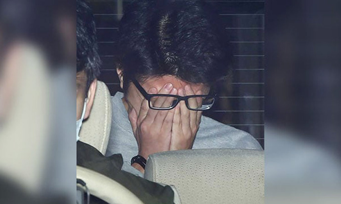 Shiraishi che mặt khi bị áp giải đến văn phòng công tố ở Tokyo hồi tháng 11/2017. Ảnh: AFP.