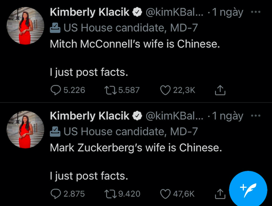 Sau đó, trong nhiều tweet (dòng trạng thái) khác, bà Kimberly Klacik chỉ ra "vợ của Mitch McConnell là người Trung Quốc", "bạn gái cũ của Eric Swalwell là người Trung Quốc", "COVID-19 đến từ Trung Quốc". Đi kèm những tweet này luôn có câu: "Tôi chỉ đăng sự thật".