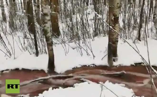 Một dòng sông nhỏ ở vùng Tây Bắc nước Nga, cách không xa biên giới Phần Lan, hoá màu đỏ tươi do máu từ cá hồi chết ở một trang trại gần đó.