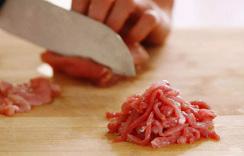 Nhiều người thường không quá chú trọng bước này. Khi thái thịt, họ thường thái thành từng dải hoặc miếng lớn, nhưng trên thực tế loại thịt nào cũng có đường vân. Tốt nhất nên thái ngang thớ thịt, như thế khi thịt chín sẽ ngon và mềm hơn hẳn.