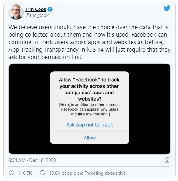 "Chúng tôi tin rằng người dùng nên có quyền quyết định đối với dữ liệu mà họ bị thu thập và cách dữ liệu đó được sử dụng. Facebook vẫn có thể theo dõi người dùng trên các ứng dụng và trang web như trước đây, App Tracking Transparency trên iOS 14 chỉ yêu cầu sự cho phép trước từ người dùng", Tim Cook viết trên Twitter. Tweet hiện thu hút gần 111.000 lượt thích, 16.400 retweet.