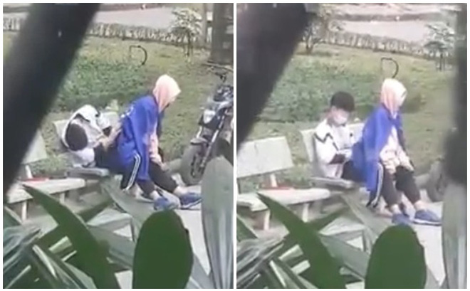 Theo những gì được ghi lại, cặp đôi này đeo khẩu trang che kín mặt và mặc áo đồng phục học sinh. Ngồi trên ghế đá giữa công viên, họ đã có những màn thân mật, gần gũi da thịt khiến những người chứng kiến phải "đỏ mặt".