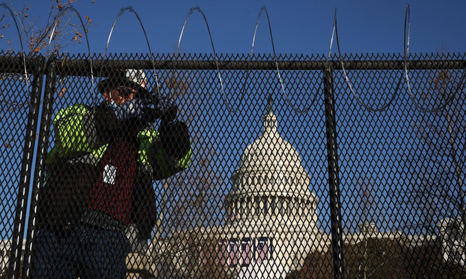 Công nhân lắp hàng rào và lưới thép gai quanh Đồi Capitol hôm 14/1. Ảnh: AFP.