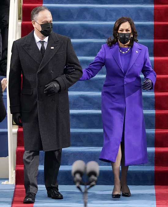 Kamala Harris đã làm nên lịch sử khi trở thành người phụ nữ đầu tiên, người da màu đầu tiên và người Mỹ gốc Nam Á đầu tiên nắm giữ vị trí phó tổng thống của nước Mỹ. Trong buổi lễ nhậm chức, bà mặc trang phục gam tím của hai nhà thiết kế da đen trẻ tuổi - Christopher John Rogers và Sergio Hudson. Cả vòng cổ ngọc trai cùng giày cao gót trên set đồ của bà cũng do các nhà thiết kế da màu thực hiện.