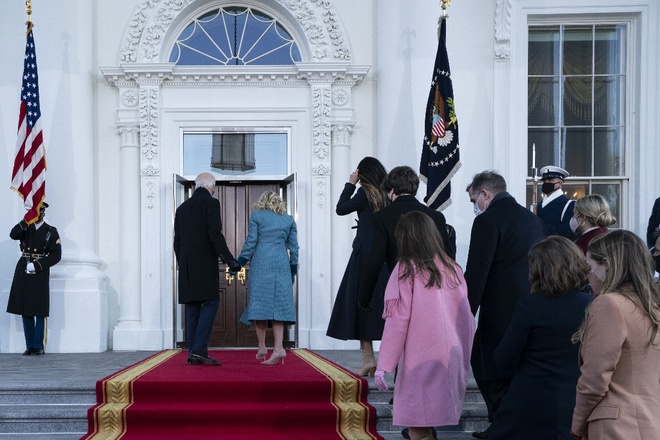 Sau lễ nhậm chức tại Điện Capitol và diễu hành trên Đại lộ Pennsylvania hôm 20/1, Tổng thống Joe Biden và vợ tiến đến Nhà Trắng. Hai người bước lên bậc thêm về phía Cửa Bắc, sau khi vẫy tay chào đám đông.
