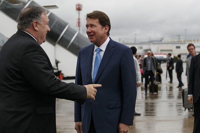 Ông Hagerty nói chuyện với cựu Ngoại trưởng Mike Pompeo ngày 27/6/2019. Ảnh: AP.