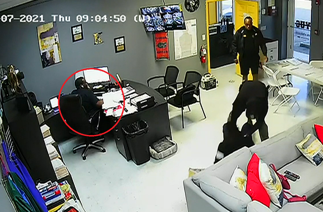 Hiệu trưởng Delvin King ngồi yên khi học sinh bị nhân viên bảo vệ quật ngã. Ảnh chụp màn hình.