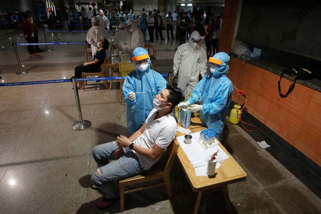 Tại sân bay Tân Sơn Nhất, hành khách sẽ được thực hiện lấy mẫu dịch hầu họng để tầm soát Covid-19.