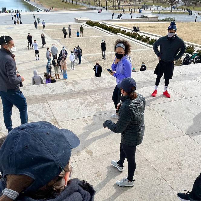 Theo BI, Tran và bạn gái phát hiện bà Harris đang chạy lên chạy xuống cầu thang dưới chân Đài tưởng niệm Lincoln cùng phu quân Doug Emhoff và nhân viên mật vụ.