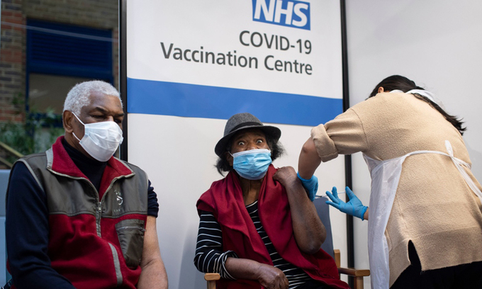 Nhân viên y tế tiêm vaccine Covid-19 cho người cao tuổi tại Bệnh viện Guy's ở London, Anh tháng 12/2020. Ảnh: AP.