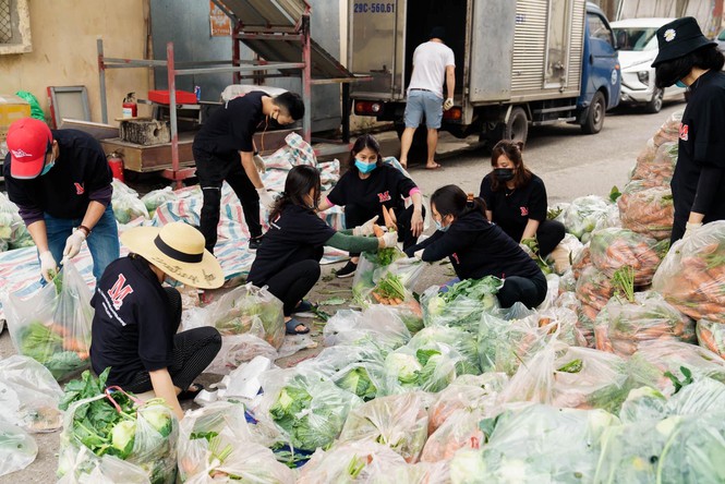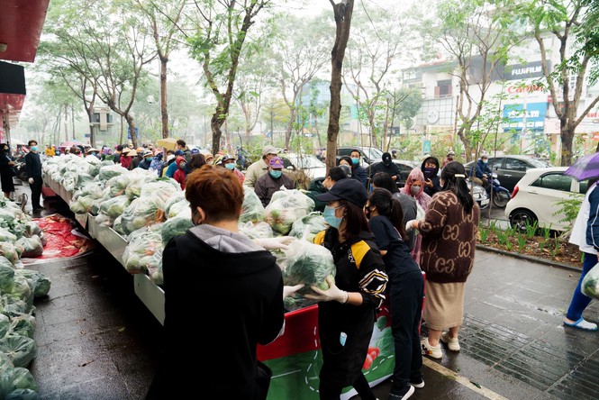 Sáng cuối tuần, dưới cơn mưa nặng hạt, người dân Hà Nội đeo khẩu trang, mặc áo mưa, che ô xếp hàng tuần tự nhận nông sản miễn phí. Mỗi lượt xếp hàng nhận được 1 túi rau củ gồm su hào, bắp cải, cà rốt, ổi. Nhân viên cửa hàng thành tình nguyện viên, hướng dẫn người dân xếp hàng, đóng gói nông sản.