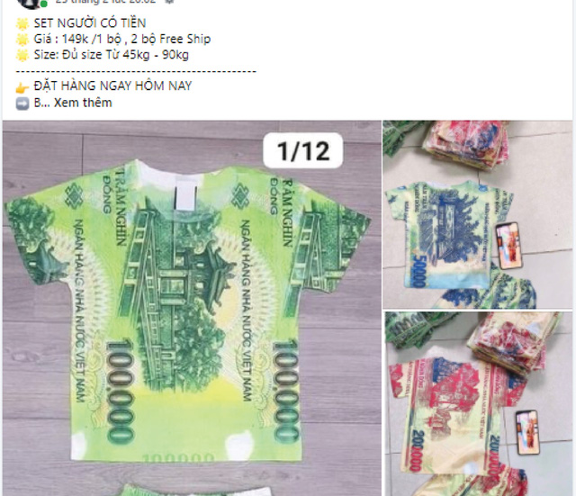 Được biết, mặt hàng này được rao bán khá nhiều tại các chợ bán hàng online với mức giá từ 120.000 đến 150.000 đồng/bộ. Người bán cũng quảng cáo bộ đồ mang ý nghĩa "gọi tài lộc" về cho người mặc. Tại các post chia sẻ bán hàng, rất nhiều người đặt mua vì tò mò hoặc thích thú với họa tiết lạ.Theo quy định, tiền Việt Nam bao gồm tiền giấy và tiền kim loại do Ngân hàng Nhà nước Việt Nam phát hành, là phương tiện thanh toán hợp pháp trên lãnh thổ nước CHXHCN Việt Nam. Hành vi in ấn hình ảnh tiền Việt Nam lên trang phục (quần áo) là hành vi vi phạm pháp luật.