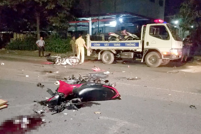Sau tiếng động mạnh nghe rợn người, nhân viên bảo vệ chạy ra kiểm tra thì thấy 4 người nằm bất tỉnh bên cạnh 2 xe máy biến dạng. 2 người đã tử vong, 2 người trọng thương.