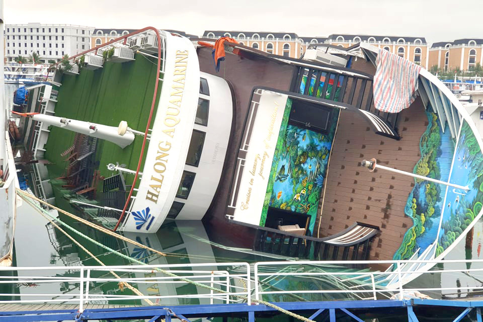 Du thuyền Halong Aquamarine bất ngờ lật ngang khi đang neo đậu tại cảng tàu Tuần Châu.