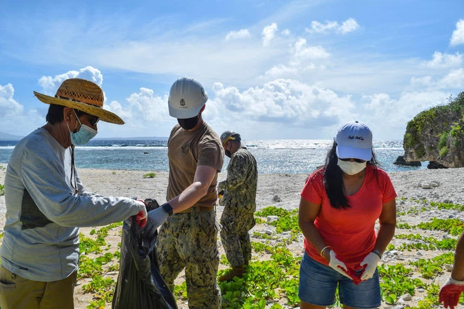 Kỹ sư hải quân Mỹ giúp người dân bản địa dọn dẹp bãi biển ở Tinian, thuộc Thịnh vượng chung Quân đảo Bắc Mariana, ngày 17/8/2020 (Ảnh: US Navy)