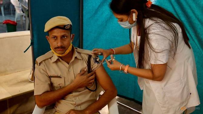 Một cảnh sát Ấn Độ được tiêm vaccine COVISHIELD sản xuất trong nước, ngày 4/2/2021. Ảnh: Reuters