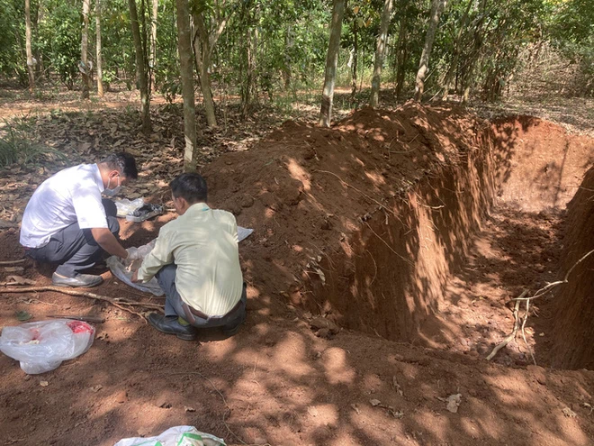 Ông Nguyễn Văn Leo, một người dân phát hiện và trình báo sự việc cho biết khoảng 15 giờ ngày 22-3, xuất hiện nhiều người đàn ông tới đào một hố sâu gần 3m, rộng 3m, dài 25m tại một mảnh đất giữa rừng cao su. Đến 19 giờ, xuất hiện 3 xe ben chở rất nhiều heo đổ xuống hố.