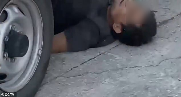 Một người đàn ông mắc kẹt ở gầm xe tải. Đây là người duy nhất còn sống sót sau vụ trả đũa. Ảnh: CCTV