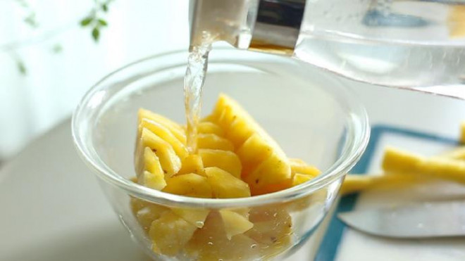 6. Khi ăn dứa nhiều người có cảm giác ngứa ran, rát lưỡi. Chỉ cần bạn ngâm 1 quả dứa với 1 thìa cà phê muối, 1 ít nước sôi để nguội trong vòng 10 phút sẽ giải quyết được vấn đề này.