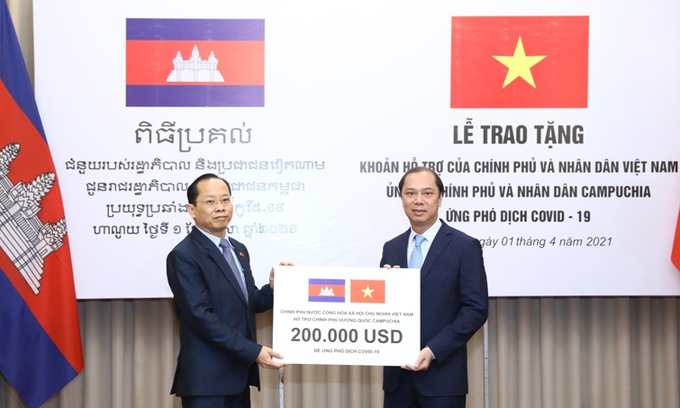 Việt Nam tặng Campuchia 200.000 USD ứng phó Covid-19. Thứ trưởng Ngoại giao Nguyễn Quốc Dũng mới đây trao số tiền 200.000 USD cho Đại sứ Campuchia tại Việt Nam hỗ trợ Campuchia phòng dịch.