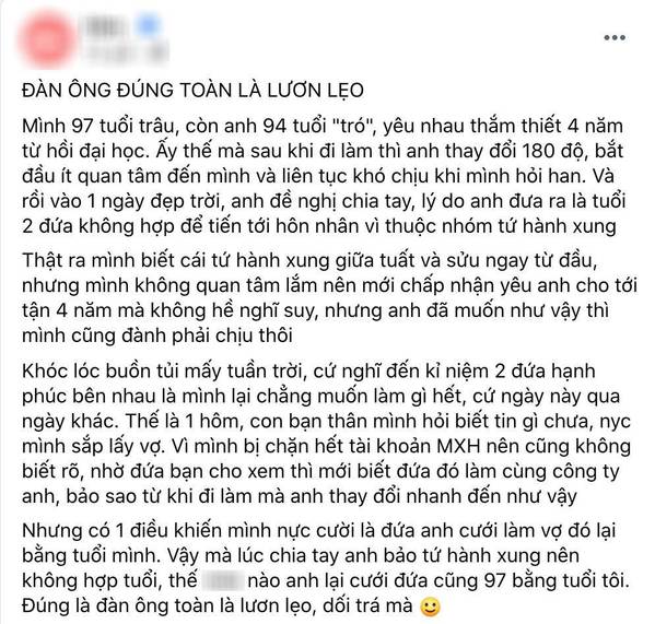 Sau đó ít lâu, cô mới biết anh đã chuẩn bị lấy vợ, điều đáng nói cô vợ tương lai của anh cũng sinh năm 1997 khiến cô ấm ức: “Vậy mà lúc chia tay anh bảo tứ hành xung nên không hợp tuổi, thế nào anh lại cưới đứa cũng 97 bằng tuổi tôi. Đúng là đàn ông toàn là lươn lẹo, dối trá mà”.