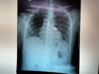 Các bác sĩ khoa Cấp cứu nhanh chóng xử trí cấp cứu và thực hiện các xét nghiệm, siêu âm, chụp Xquang tim phổi thẳng, chụp cắt lớp vi tính lồng ngực… Việc hội chẩn phẫu thuật được ê-kíp bác sĩ khẩn tiến hành và thống nhất phương án xử lý thám sát vết thương và lấy dị vật cấp cứu.