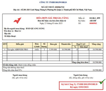Đến lúc này, nghi ngờ mình bị lừa, anh Tiến tìm đến chi nhánh Công ty Cổ phần Thế giới số (Digiworld) tại Hà Nội để xác minh thông tin. Nhân viên tại đây cho biết toàn bộ số tai nghe anh Tiến nhận được là hàng nhái và thông tin về pháp nhân Công ty TNHH Digiworld là giả mạo, không liên quan đến Digiworld.