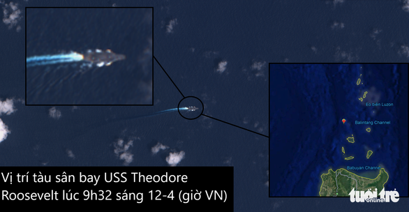 Trước khi rời Biển Đông, hàng không mẫu hạm của Hoa Kỳ đã bám sát hàng không mẫu hạm Liêu Ninh của Trung Cộng. Hình ảnh vệ tinh của công ty Planet Hoa Kỳ chụp vào chiều 12 tháng 4 cho thấy, tàu Liêu Ninh cũng đã di chuyển đến khu vực khác cách đảo Hải Nam khoảng 290km về phía đông.