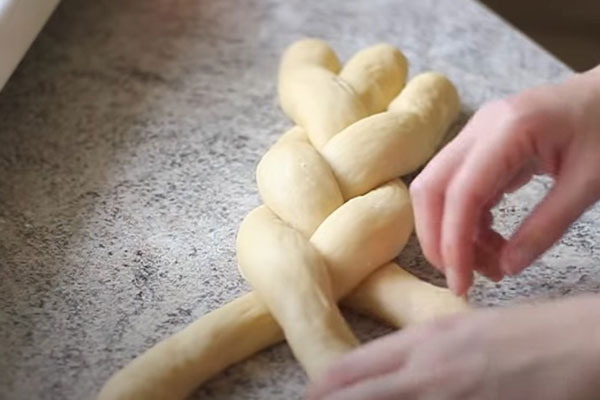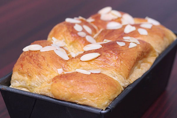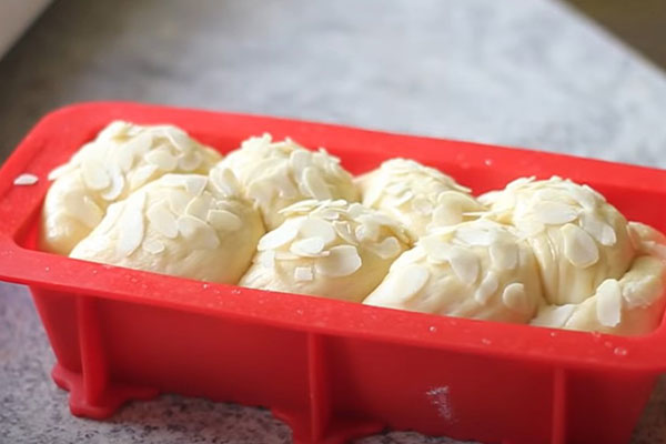 Bột sau khi ủ xong, bạn chia thành 3 phần bằng nhau. Để tạo hình, bạn thực hiện như sau: Túm mép để bột thành viên tròn, mặt mịn, sau đó vê dài khoảng 18 – 20cm, làm như vậy cho 3 phần bột. Sau đó, bạn đặt 3 phần bột đã vê dài song song và bắt đầu đan chéo chúng vào nhau (như thắt bím tóc). Tiến hành cho bột vào khuôn, ủ đến khi bột nở khoảng 80%. Tiếp tục dùng cọ để phết nhẹ phần trứng dư và xếp hạnh nhân lên bề mặt bánh.