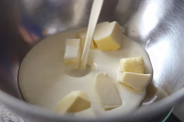 Bạn cho bơ, đường, kem tươi, sữa tươi không đường với định lượng đã chuẩn bị vào âu inox, đặt lên nồi nước đang nấu sôi, chúng ta sẽ dùng hơi nóng của nước để khuấy tan các nguyên liệu. Để hỗn hợp bơ sữa nguội về khoảng 30 – 35 độ C.