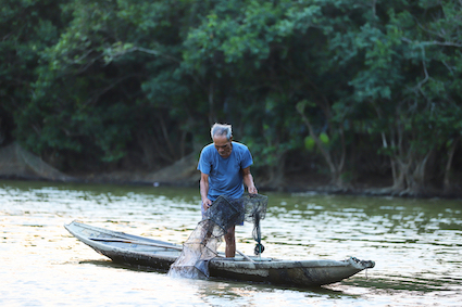 Sáng sớm, ông Đáp thường chèo thuyền đi kéo "lừ" để thu hoạch tôm, cá trong vuông nước giữa rừng ngập mặn. Đây là nghề chính giúp hai vợ chồng ông có nguồn thu nhập duy trì cuộc sống.