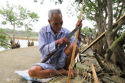 Khi không đi thuyền bắt tôm cá, ông Đáp thường ngồi vót tre để sửa chữa lại hai nhà chồ cạnh nhà.