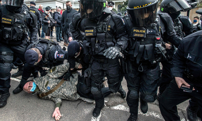Cảnh sát Czech bắt người biểu tình ủng hộ Nga trước đại sứ quán Nga ở Prague hôm 18/4. Ảnh: AFP.