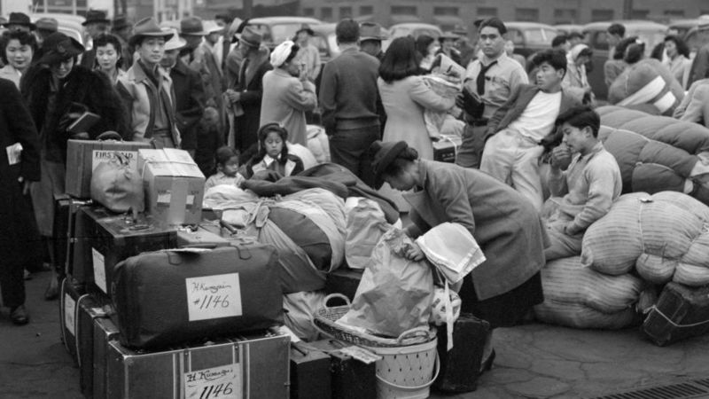 Người Mỹ gốc Nhật ở Nam California chờ được lên xe lửa đưa vào trại tập trung năm 1942