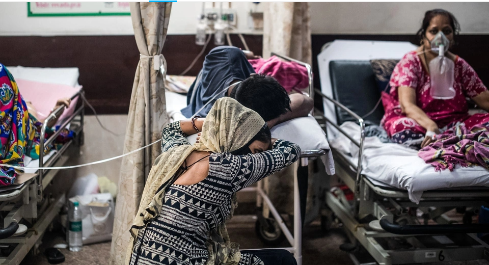 Tiến sĩ Ashish Jha, Hiệu trưởng Trường Y tế Công cộng của Đại học Brown ở Mỹ, cho biết ông lo ngại về việc các nhà hoạch định chính sách Ấn Độ mà ông tiếp xúc tin rằng mọi thứ sẽ được cải thiện trong vài ngày tới. "Tôi đã…cố gắng nói với họ rằng 'Nếu mọi việc suôn sẻ, tình hình sẽ còn tồi tệ trong vài tuần tới. Thậm chí lâu hơn nữa"', ông nói. Trong ảnh, người thân ngồi nghỉ bên cạnh bệnh nhân Covid-19. Ảnh: Getty Images.