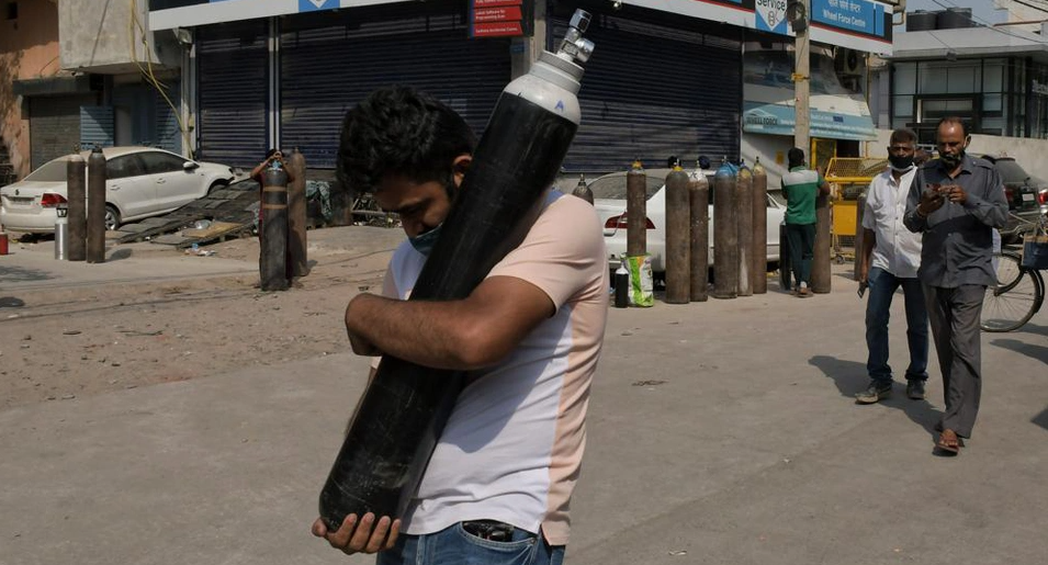 Đợt bùng phát phản ánh sự mong manh của hệ thống y tế của Ấn Độ. Tòa án Cấp cao New Delhi tuyên bố sẽ bắt đầu trừng phạt giới chức trách nếu nguồn cung cấp oxy không được phân bổ đến các bệnh viện. Trong ảnh, một người đàn ông vác bình xilanh đã được đổ đầy oxy trong khi người nhà các bệnh nhận Covid-19 khác đang chờ đến lượt họ ở New Delhi. Ảnh: AP.