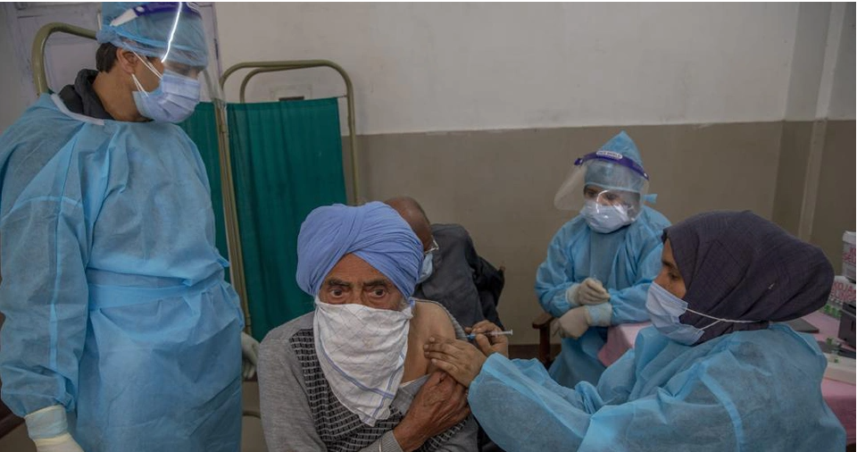 Tồi tệ hơn, dù là nước sản xuất vaccine lớn nhất thế giới, Ấn Độ đang thiếu vaccine - hậu quả của việc sản xuất tụt hậu và thiếu nguyên liệu thô. Trong ảnh, một người đàn ông Kashmiri được tiêm vaccine Covid-19 tại một trung tâm y tế ban đầu ở Srinagar, vùng Kashmir do Ấn Độ kiểm soát. Ảnh: AP.