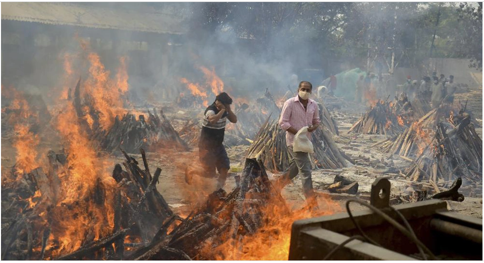 Tính đến sáng 4/5, Ấn Độ ghi nhận thêm hơn 357.000 ca mắc Covid-19 mới, nâng tổng số ca nhiễm chính thức lên hơn 20 triệu, trong khi số ca tử vong chính thức là hơn 220.000 người. Trong ảnh, người thân khiêng thi thể của một người chết vì Covid-19 trong khi nhiều nạn nhân khác đang được hỏa thiêu tại lò hỏa táng ở New Delhi. Ảnh: AP.