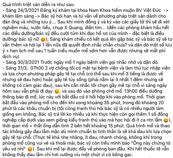 Theo anh C., quá trình mổ khá nhẹ nhàng, không quá đau, không khí cũng vui vẻ; chỉ mất khoảng 35 phút là tiến hành xong, trong đó có 20 phút chuẩn bị. Được biết, sau tiểu phẫu, mọi sinh hoạt cá nhân và công việc của anh C. diễn ra hoàn toàn bình thường. Toàn bộ chi phí cho biện pháp tránh thai vĩnh viễn này là 5,5 triệu đồng.