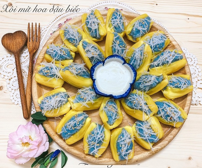 Món xôi lạ mắt với màu tím của đậu biếc, màu vàng của mít, lại khá đơn giản để bạn trổ tài.
