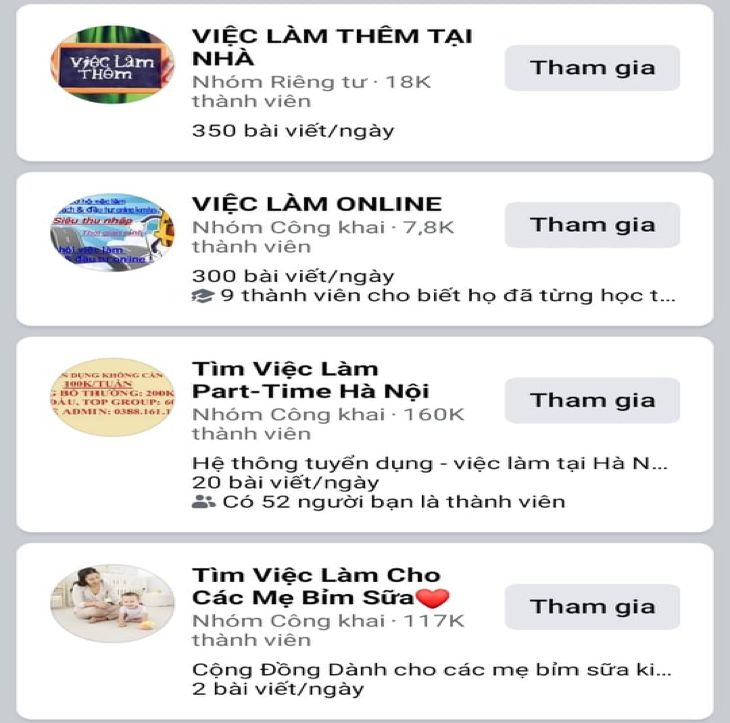Với sự phát triển mạnh mẽ của mạng xã hội, lao động có thể tìm kiếm việc làm qua mạng xã hội một cách dễ dàng. Chỉ cần gõ từ khóa '' việc làm online'' thì người dùng có thể tiếp cận với hàng loạt hội nhóm công khai như: Nhóm "Việc làm online" có tới hơn 7,6 nghìn thành viên, "Kiếm tiền online" có hơn 123 nghìn thành viên; "Việc làm thêm online tại nhà" 3,1 nghìn thành viên… Hoặc các hội nhóm trên Zalo với tên gọi hấp dẫn như Kho báu 4.0, nhóm đầu tư kiếm tiền mùa dịch Covid -19, …