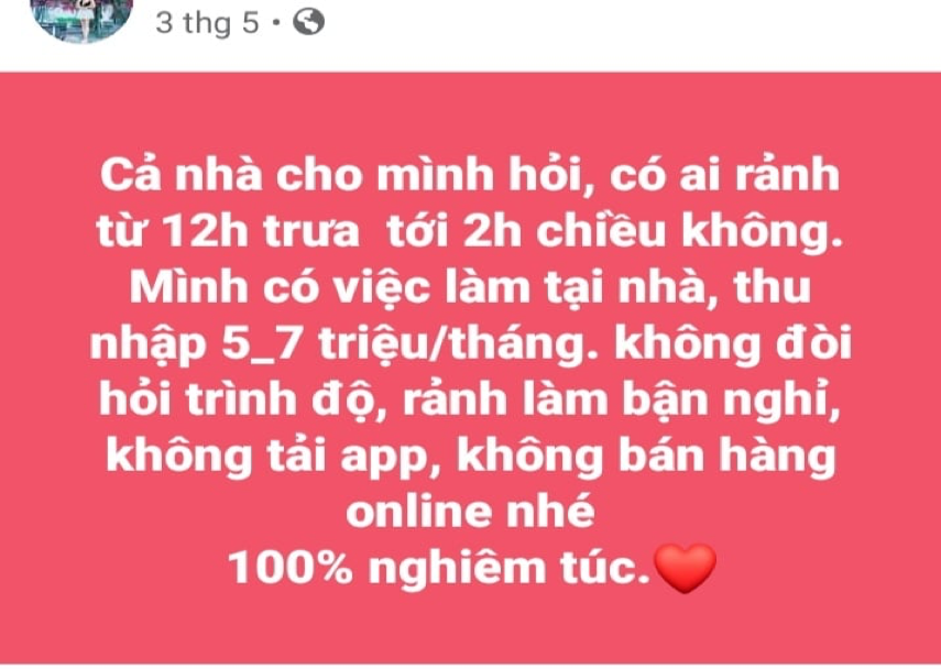 Không cần có kinh nghiệm, việc nhẹ, lương cao, không cần đặt cọc, chỉ cần có máu kiếm tiền thì có thể được đào tạo ngay từ đầu. Yêu cầu chỉ cần có điện thoại, làm việc tại nhà, giờ giấc linh hoạt, thu nhập có thể 400 - 500 nghìn đồng/ngày.