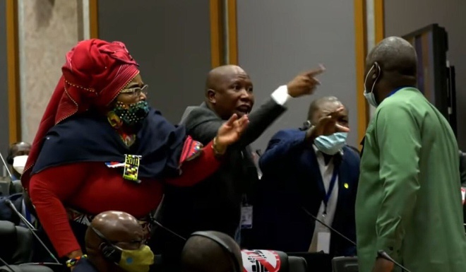 Tiếp đến, một nam nghị sĩ tức giận xé toạc áo khoác của mình và tung một cú đá về phía nữ nghị sĩ Pemmy Majodina của Nam Phi.
