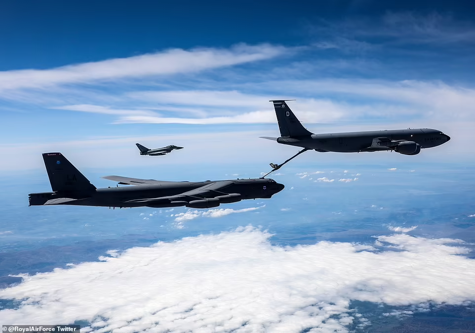 Một máy bay ném bom hạt nhân B-52 của Mỹ được hộ tống bởi chiến đấu cơ Typhoon của Anh khi nó bay qua nước này trong khuôn khổ cuộc tập trận của NATO Allied Sky hôm thứ Hai