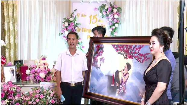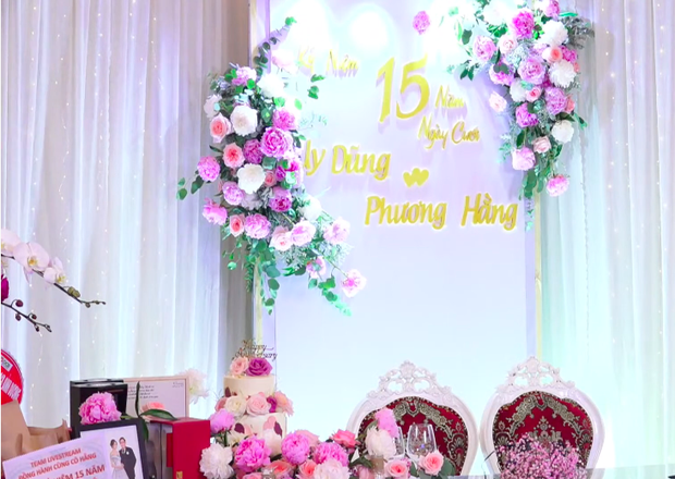 Mặc dù chỉ tổ chức "tiệc mừng online" tại nhà nhưng bà Phương Hằng và ông Dũng "lò vôi" đã đầu tư hẳn 1 khu vực trang trí hoa tươi, bánh kem và ảnh kỷ niệm vô cùng hoành tráng. Xuất hiện trong ngày đặc biệt, bà Phương Hằng ăn diện sang trọng, hở bạo quyến rũ và make up lộng lẫy y hệt như cô dâu, cả hai còn cùng nhau "đập hộp" món quà ý nghĩ là bức vẽ do người hâm mộ gửi tặng.