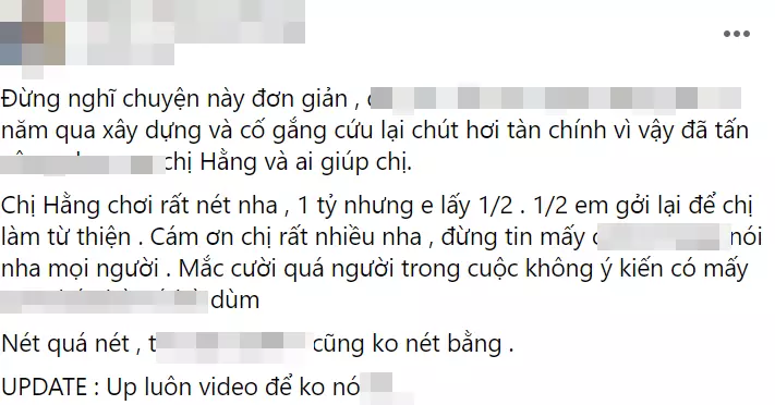 "Chị Hằng chơi rất nét nha, 1 tỷ nhưng em lấy một nửa (500 triệu), phần còn lại em gửi để chị làm từ thiện. Cảm ơn chị rất nhiều nha. Mắc cười quá, người trong cuộc không ý kiến có mấy con 'chúa hò' nó hò dùm", nam thanh niên khoe với mọi người cách đây hơn nửa tháng.
